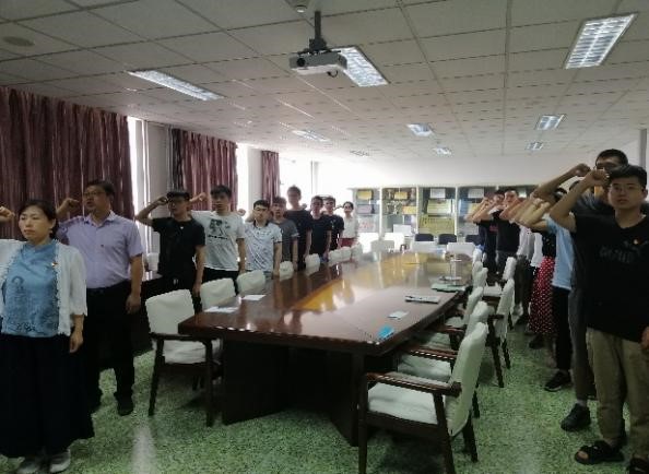 活动中,研究生辅导员梁雪莲同志带领新老党员面对鲜红的党旗庄重肃穆地宣读入党誓词:“我志愿加入中国共产党,拥护党的纲领,遵守党的章程……”。各位党员高举右手庄严宣誓,声音铿锵有力,每一位党员再一次接受心灵的洗礼,进一步坚定了入党初心。