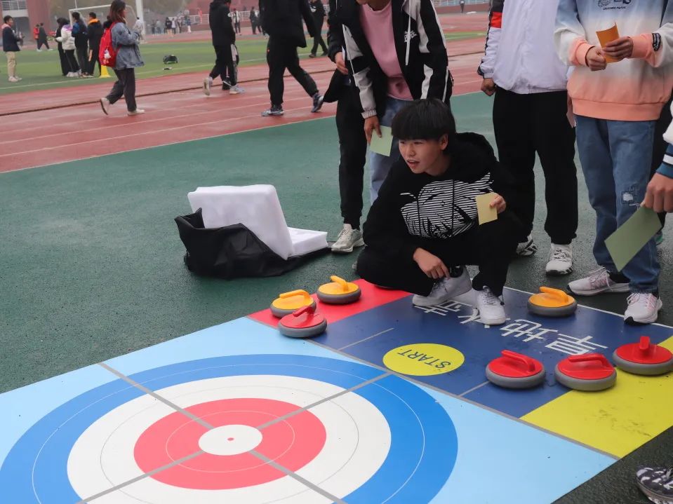 旱地冰壶,是冬季奥运会的普及项目,激起了同学们极高的兴趣。向前瞄准,仔细准备,精准投掷,冰壶从同学手中投掷出去,每一个人都全力以赴,集中精神,珍惜这唯一的机会。